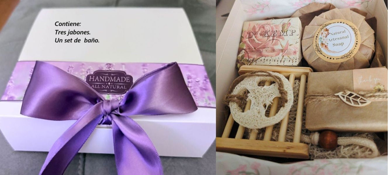 Este arreglo contiene tres jabones y un set de baño.